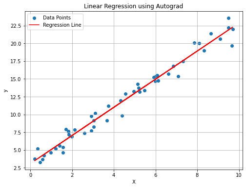 # Import necessary librariesimport numpy as npimport matplotlib.pyplot as pltimport autograd.numpy as ag_npfrom autograd import grad# Generate some random data and form a linear functionnp.random.seed(42)X = np.random.rand(50, 1) *10y =2* X +3+ np.random.randn(50, 1) # noisy line# Define the linear regression modeldef linear_regression(params, x):return ag_np.dot(x, params[0]) + params[1]# Define the loss function = mean squared errordef mean_squared_error(params, x, y): predictions = linear_regression(params, x)return ag_np.mean((predictions - y) **2)# Initialize parametersinitial_params = [ag_np.ones((1, 1)), ag_np.zeros((1,))]lr =0.01num_epochs =1000# Gradient of the loss function using autogradgrad_loss = grad(mean_squared_error)# Optimization loopparams = initial_paramsfor epoch inrange(num_epochs): gradient = grad_loss(params, X, y) params[0] -= lr * gradient[0] params[1] -= lr * gradient[1]# Extract the learned slope and interceptslope = params[0][0, 0]intercept = params[1][0]# Plot the data points and the resulting lineplt.figure(figsize=(8, 6))plt.scatter(X, y, label='Data Points')plt.plot(X, slope * X + intercept, color='red', label='Regression Line')plt.xlabel('X')plt.ylabel('y')plt.title('Linear Regression using Autograd')plt.legend()plt.grid(True)plt.show()