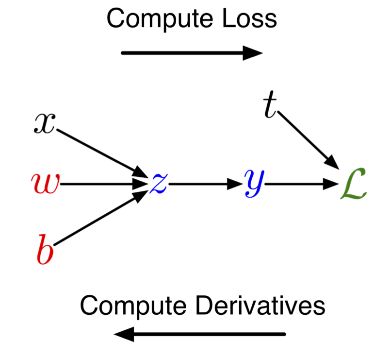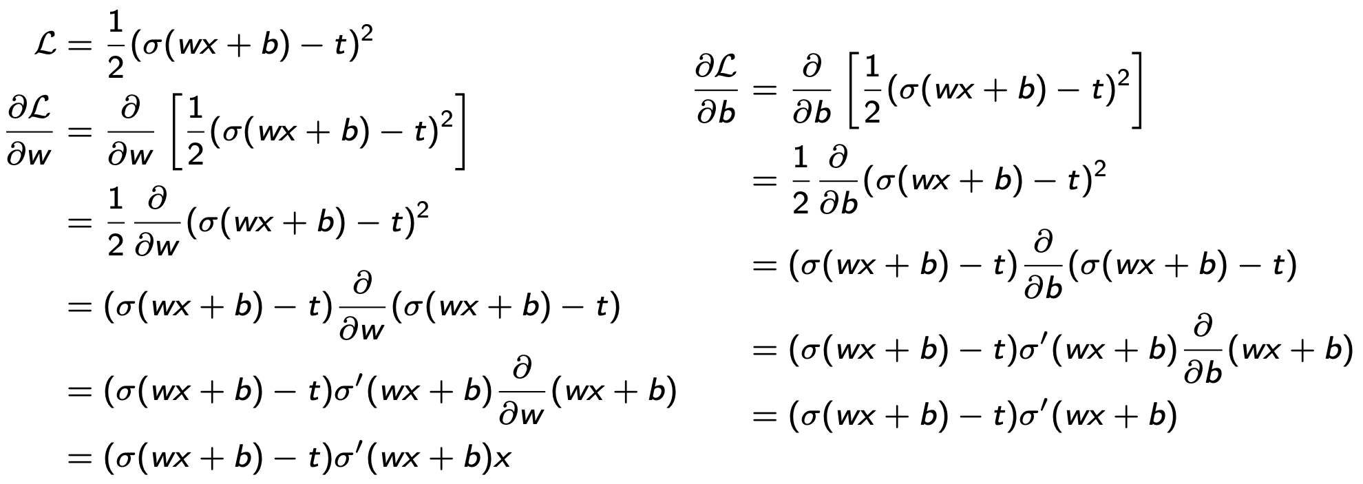 Structured approach: \[\begin{aligned} & \mathrm{compute\ loss} & & \mathrm{compute\ derivatives}\\ & \mathrm{{\color{blue}forwards}} & & \mathrm{{\color{red}backwards}}\\ z & =wx+b & \frac{\partial\mathcal{L}}{\partial y} & =y-t\\ y & =\sigma(z) & \frac{\partial\mathcal{L}}{\partial z} & =\frac{\partial\mathcal{L}}{\partial y}\frac{\partial y}{\partial z}=\frac{\partial\mathcal{L}}{\partial y}\sigma'(z)\\ \mathcal{L} & =\frac{1}{2}(y-t)^{2} & \frac{\partial\mathcal{L}}{\partial w} & =\frac{\partial\mathcal{L}}{\partial z}\frac{\partial z}{\partial w}=\frac{\partial\mathcal{L}}{\partial z}x\\ & & \frac{\partial\mathcal{L}}{\partial b} & =\frac{\partial\mathcal{L}}{\partial z}\frac{\partial z}{\partial b}=\frac{\partial\mathcal{L}}{\partial z}\cdot1 \end{aligned}\]