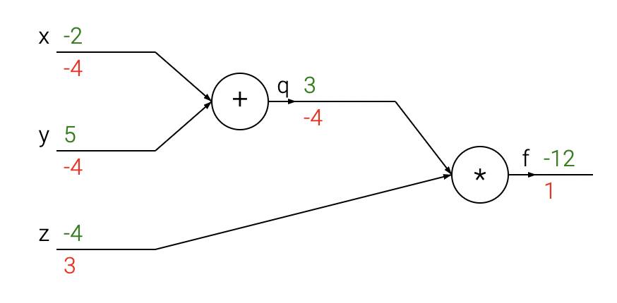 then the chain rule gives the terms of the gradient, \[\begin{aligned} \frac{\partial f}{\partial x} & =\frac{\partial f}{\partial q}\frac{\partial q}{\partial x}=z\cdot1\\ \frac{\partial f}{\partial y} & =\frac{\partial f}{\partial q}\frac{\partial q}{\partial y}=z\cdot1\\ \frac{\partial f}{\partial z} & =q \end{aligned}\]