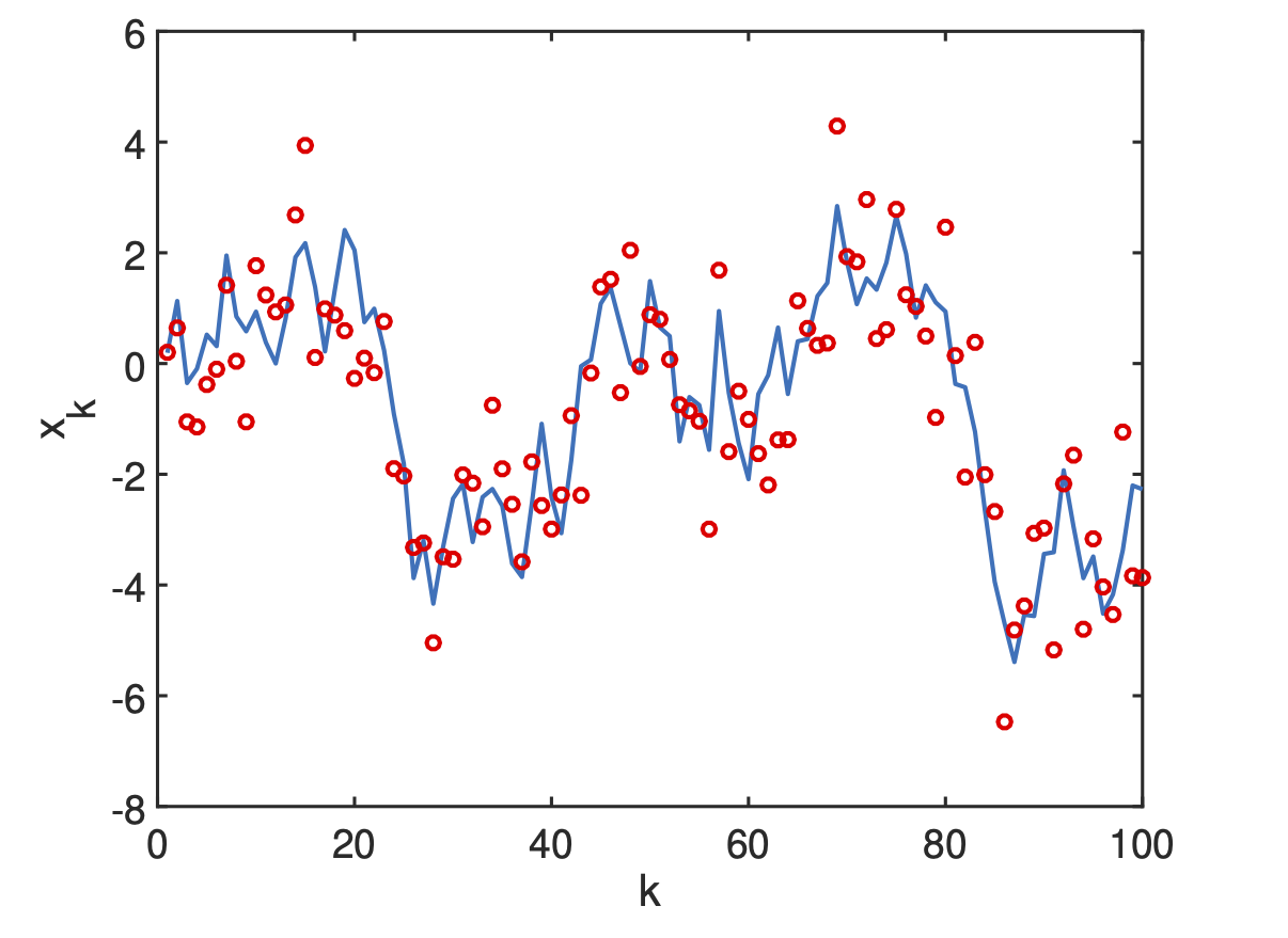 Figure 1: Gaussian random walk state space model equations 2. State, \(x_k\) is solid blue curve, measurements, \(y_k\), are red circles. Fixed values of noise variance are \(Q=1\) and \(R=1\)
