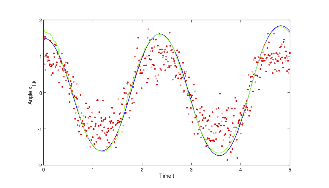 A simple discretization, based on the simplest Euler’s method, produces \[\begin{aligned} \mathbf{x}_{k} & =\mathcal{M}(\mathbf{x}_{k-1})+\mathbf{w}_{k-1}\\ {y}_{k} & =\mathcal{H}_{k}(\mathbf{x}_{k})+{v}_{k}, \end{aligned}\] where \[\begin{aligned} \mathbf{x}_{k} & =\left[\begin{array}{c} x_{1}\\ x_{2} \end{array}\right]_{k},\\ \mathcal{M}(\mathbf{x}_{k-1}) & =\left[\begin{array}{c} x_{1}+\Delta tx_{2}\\ x_{2}-\Delta t\dfrac{g}{L}\sin x_{1} \end{array}\right]_{k-1},\\ \mathcal{H}(\mathbf{x}_{k}) & =[\sin x_{1}]_{k}. \end{aligned}\]