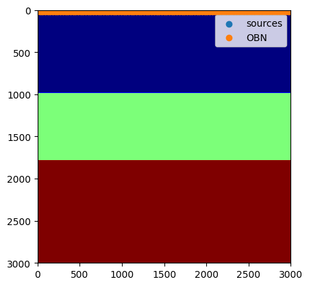 We create a split-spread geomtry with sources at the top and receivers at the ocean bottom (top of second layer).