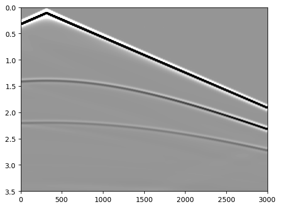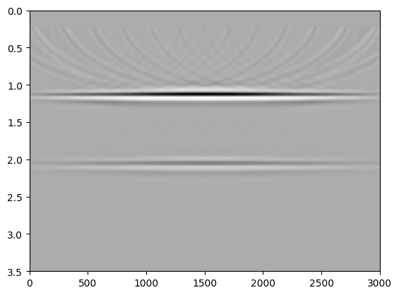 imshow(img_el', cmap="Greys", extent=data_extent, aspect="auto")Question: 1) Please repeat the same experiments (elastic and acoustic) for the case where the lower layer is slanting instead of horizontal and interpret the differences compared to the above experiments.