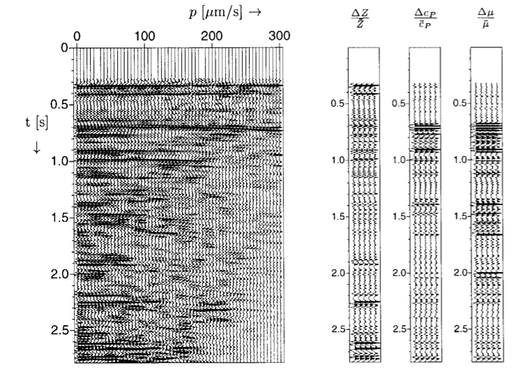 where \(R_{PP}(p)\) is the Aki–Richards linearized P-to-P reflection coefficient — a linear combination of \(\Delta\ln\rho\), \(\Delta\ln\alpha\), and \(\Delta\ln\beta\) with \(p\)-dependent weights.