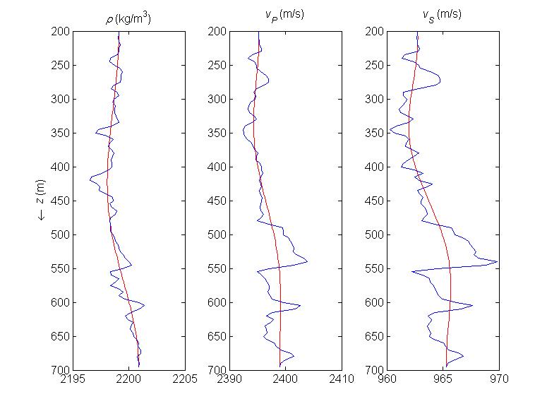 Low-contrast model (0.01\(\times\) real contrasts) with \(\rho\), \(v_P\), \(v_S\) vs. depth. Smooth red curves show the background model.