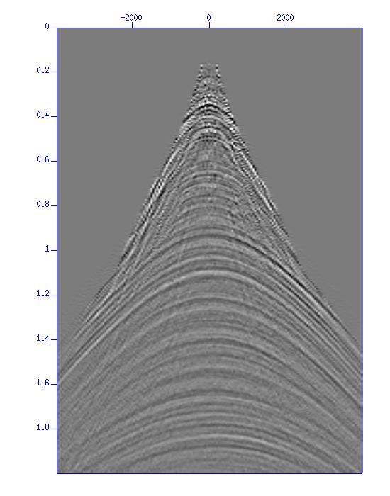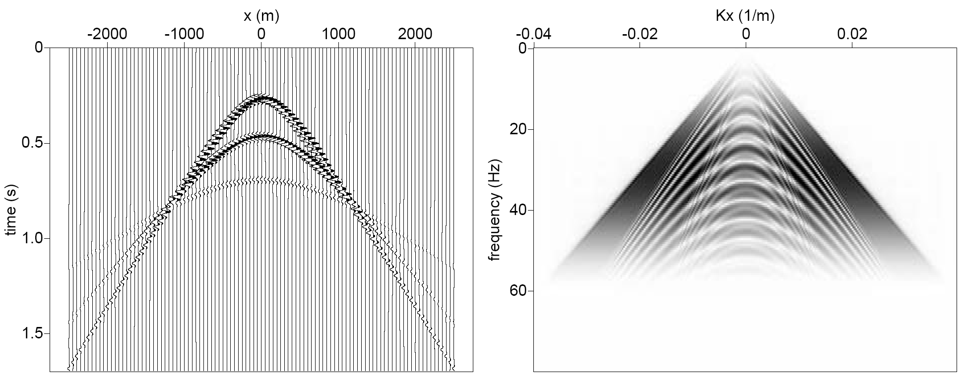 One point in the Radon domain \(m(p,\tau)\) is obtained by stacking the input data along a straight line \(t = \tau + px\).