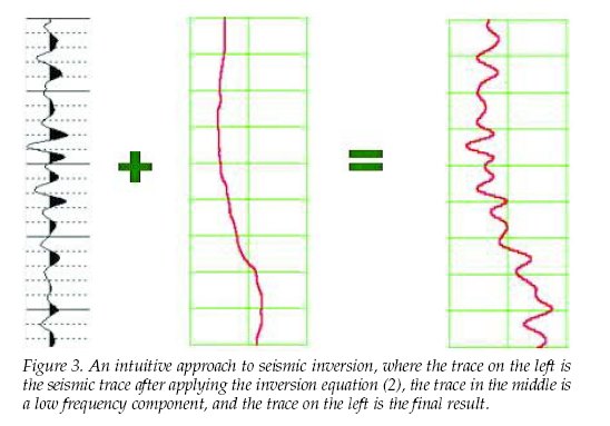 The low-frequency background comes from well logs or velocity analysis, and the band-limited perturbation is inverted from the seismic data.