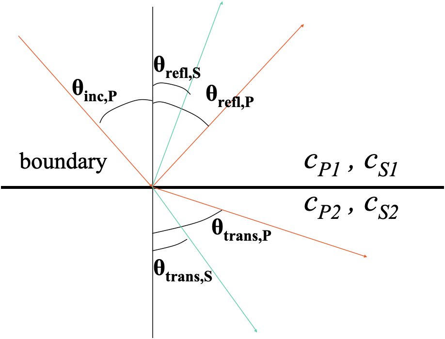 \[ \frac{\sin\theta_{P1}}{c_{P1}} = \frac{\sin\theta_{S1}}{c_{S1}} = \frac{\sin\theta_{P2}}{c_{P2}} = \frac{\sin\theta_{S2}}{c_{S2}} = p \quad \text{(ray parameter)} \]