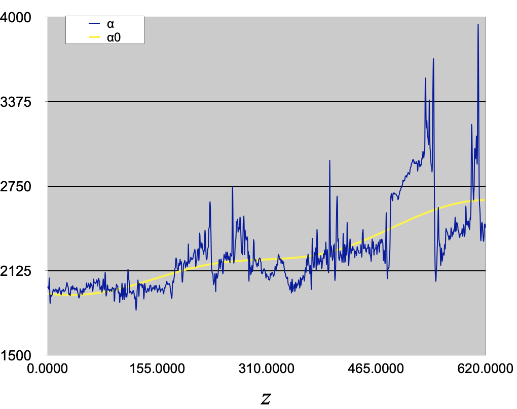 \[ \ln\alpha(z) = \ln\alpha_0(z) + \sum_i \Delta\ln\alpha_i, \quad \ln\beta(z) = \ln\beta_0(z) + \sum_i \Delta\ln\beta_i \]
