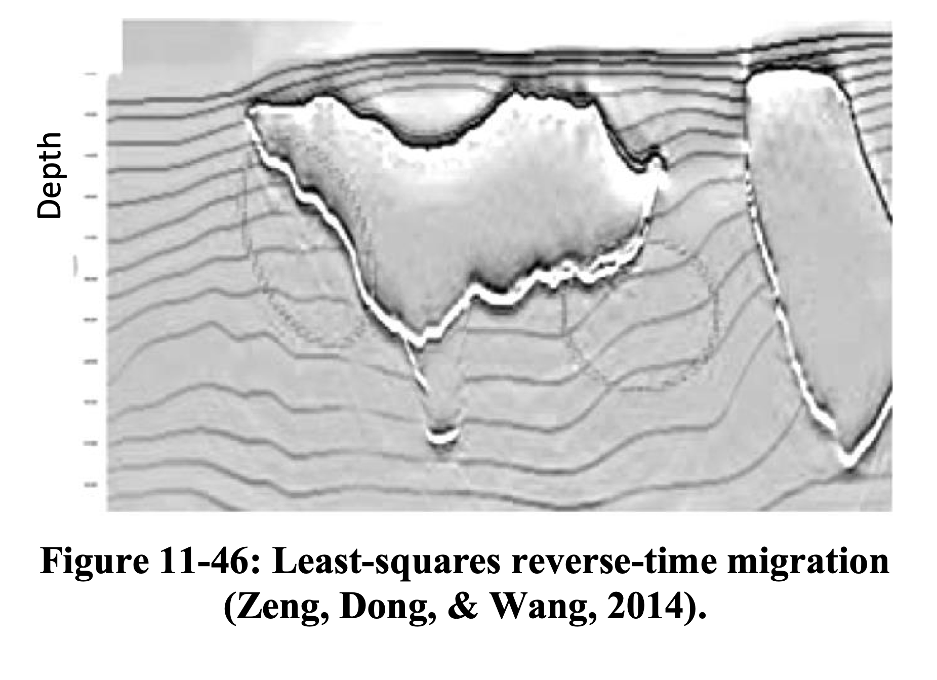 LS-RTM recovers reflector amplitudes beneath the salt body and suppresses migration artifacts (see also Hill and Rüger 2020, Ch. 11).