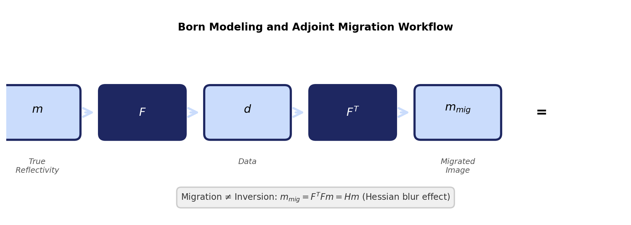 Born modeling and adjoint migration workflow. Migration applies the adjoint, not the inverse.