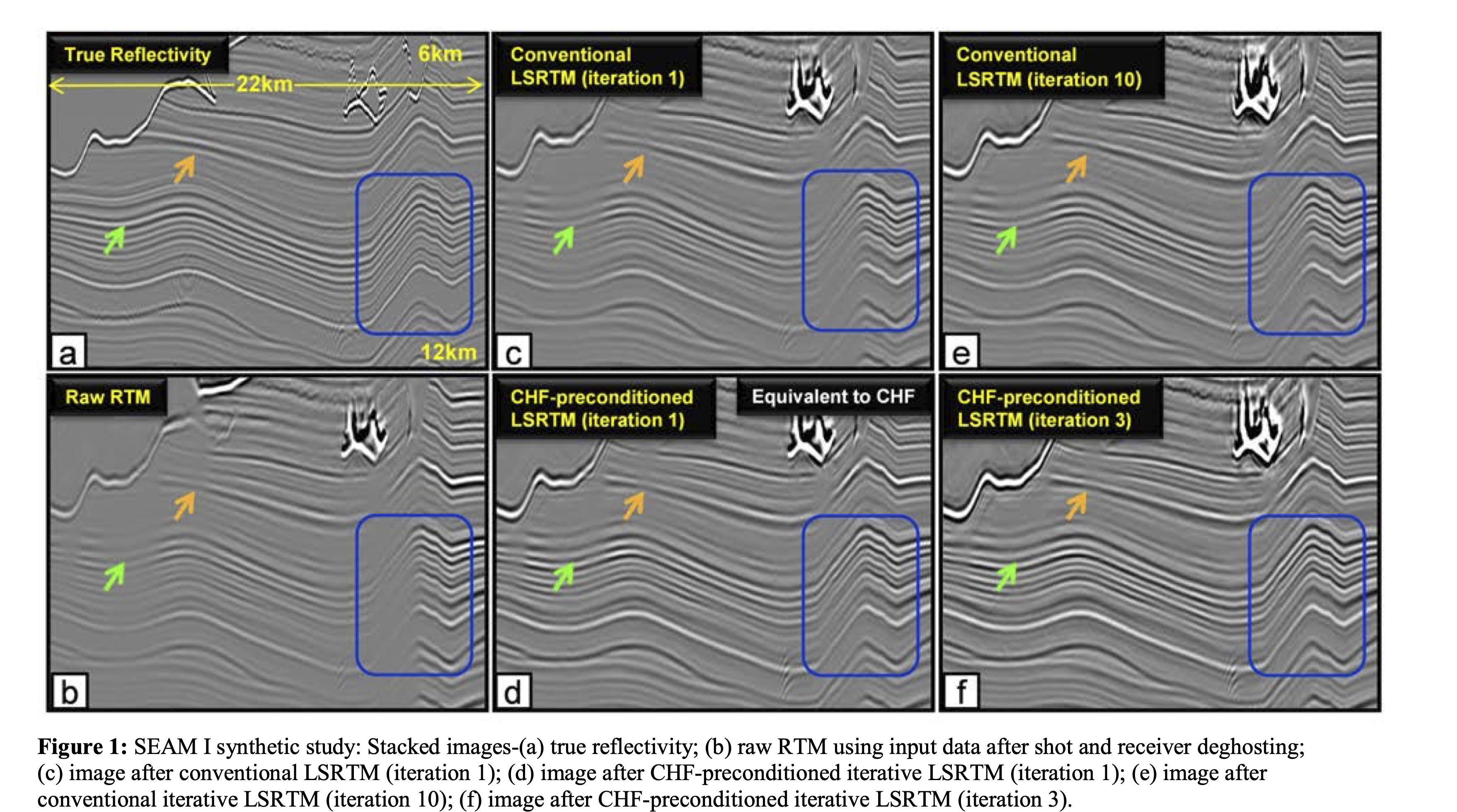 SEAM I synthetic study: (a) true reflectivity; (b) raw RTM; (c) conventional LSRTM (iteration 1); (d) CHF-preconditioned LSRTM (iteration 1); (e) conventional LSRTM (iteration 10); (f) CHF-preconditioned LSRTM (iteration 3) (Wang, Huang, and Wang 2018).