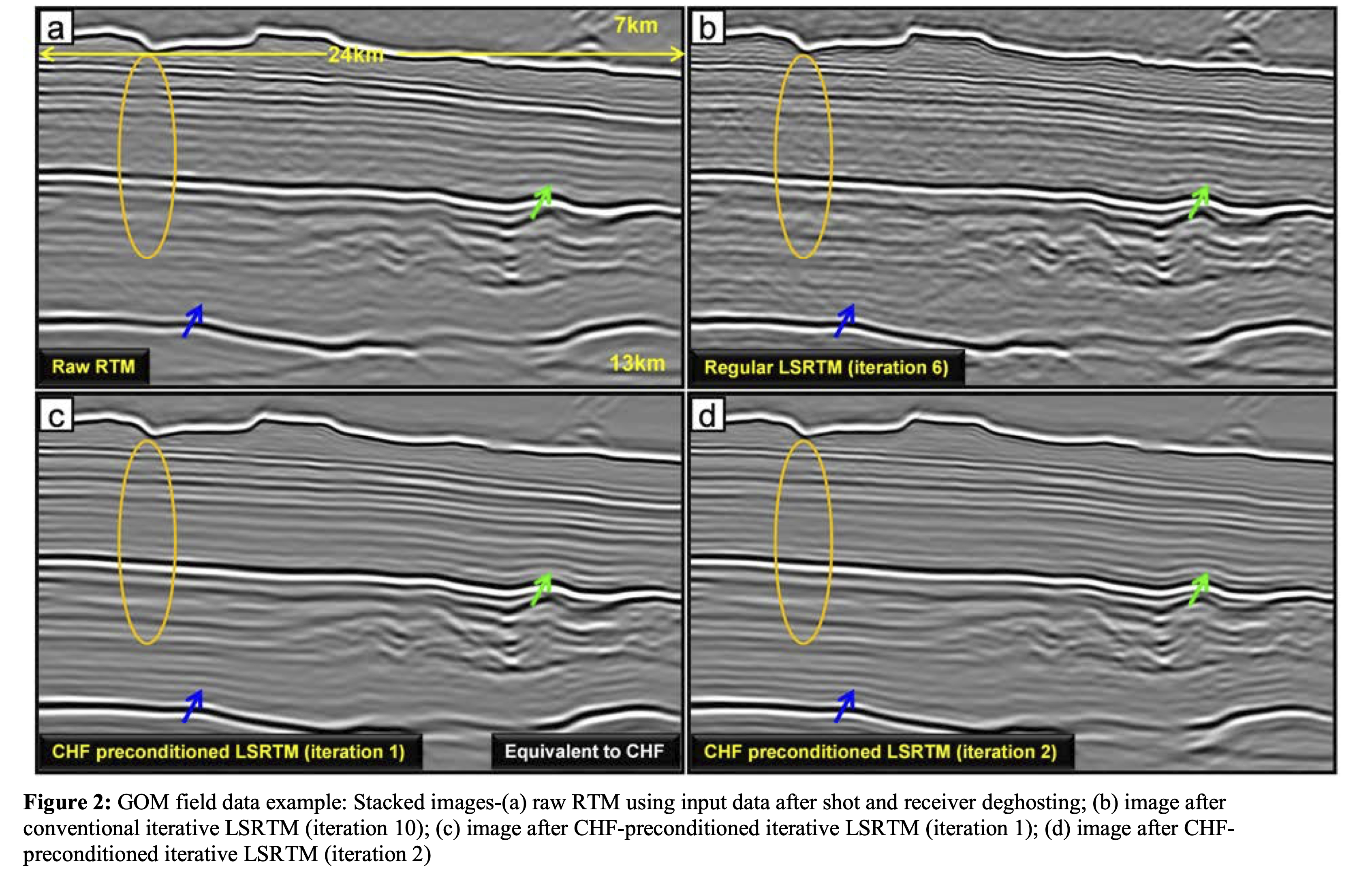 GOM field data: (a) raw RTM; (b) regular LSRTM (iteration 6); (c) CHF-preconditioned LSRTM (iteration 1, equivalent to single-iteration CHF); (d) CHF-preconditioned LSRTM (iteration 2) (Wang, Huang, and Wang 2018).
