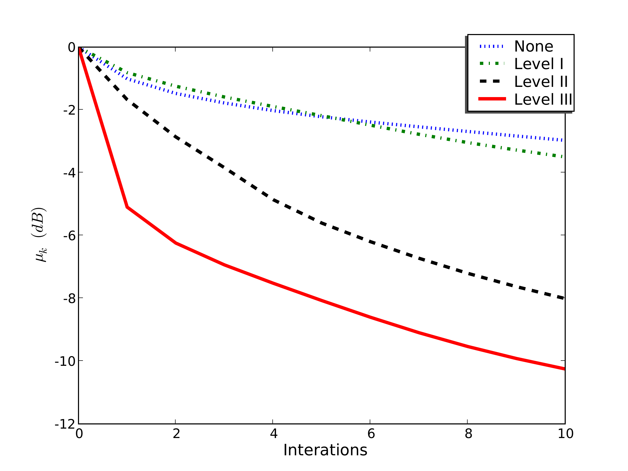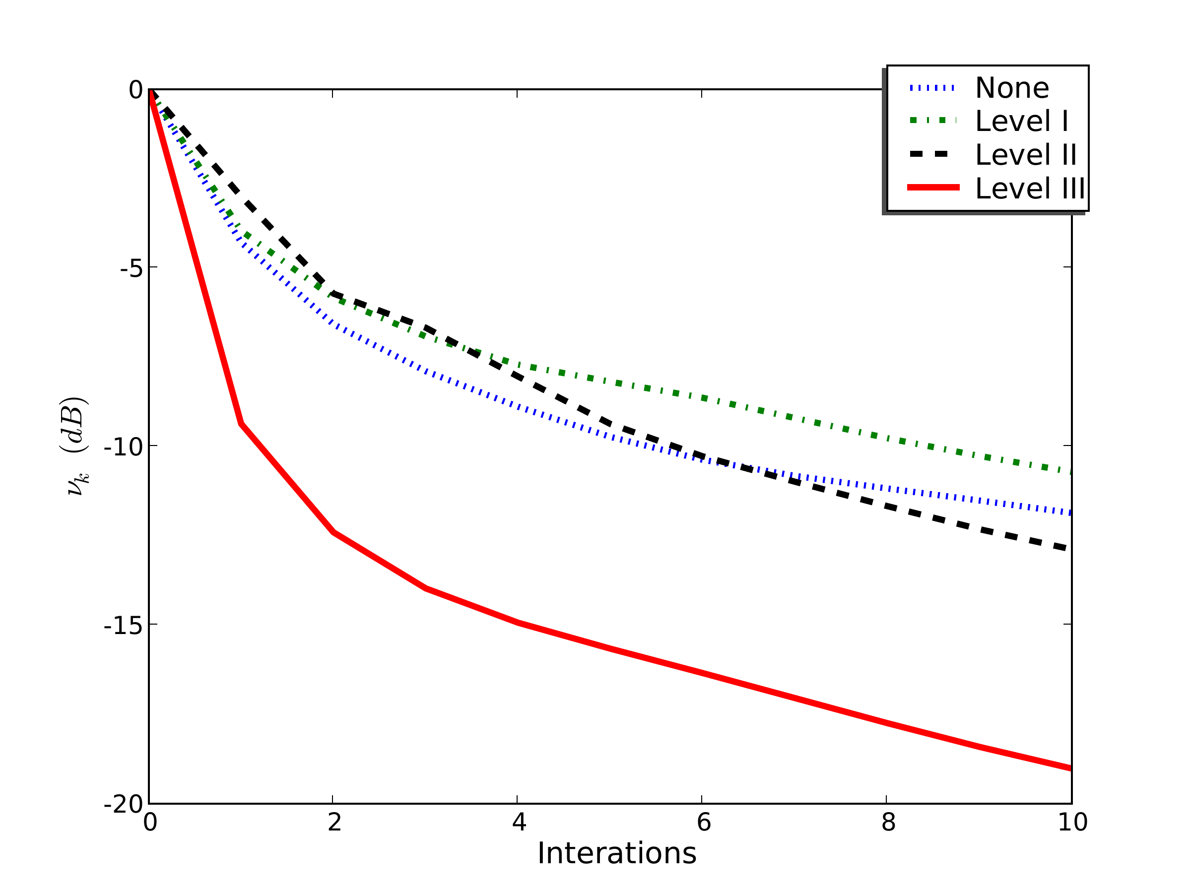 Dotted blue: no preconditioning; dash-dotted green: Level I; dashed black: Level II; solid red: Level III. Level II/III curves are offset by one iteration to account for the preconditioning overhead.