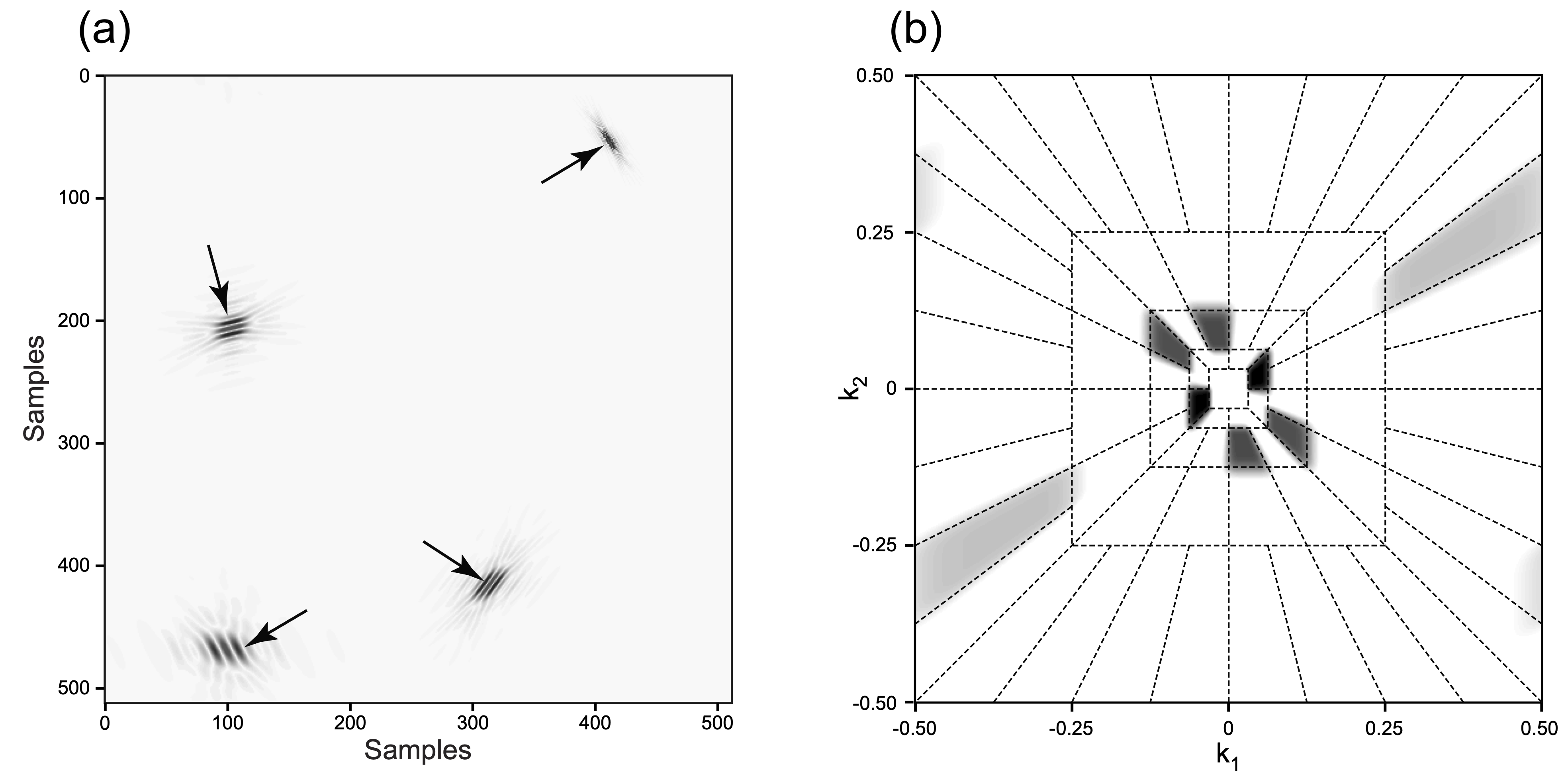 (a) Curvelet atoms in the physical domain at various scales, positions, and orientations. (b) Curvelet tiling of the 2D frequency plane showing dyadic scales with angular wedges obeying parabolic scaling (Herrmann, Moghaddam, and Stolk 2008).