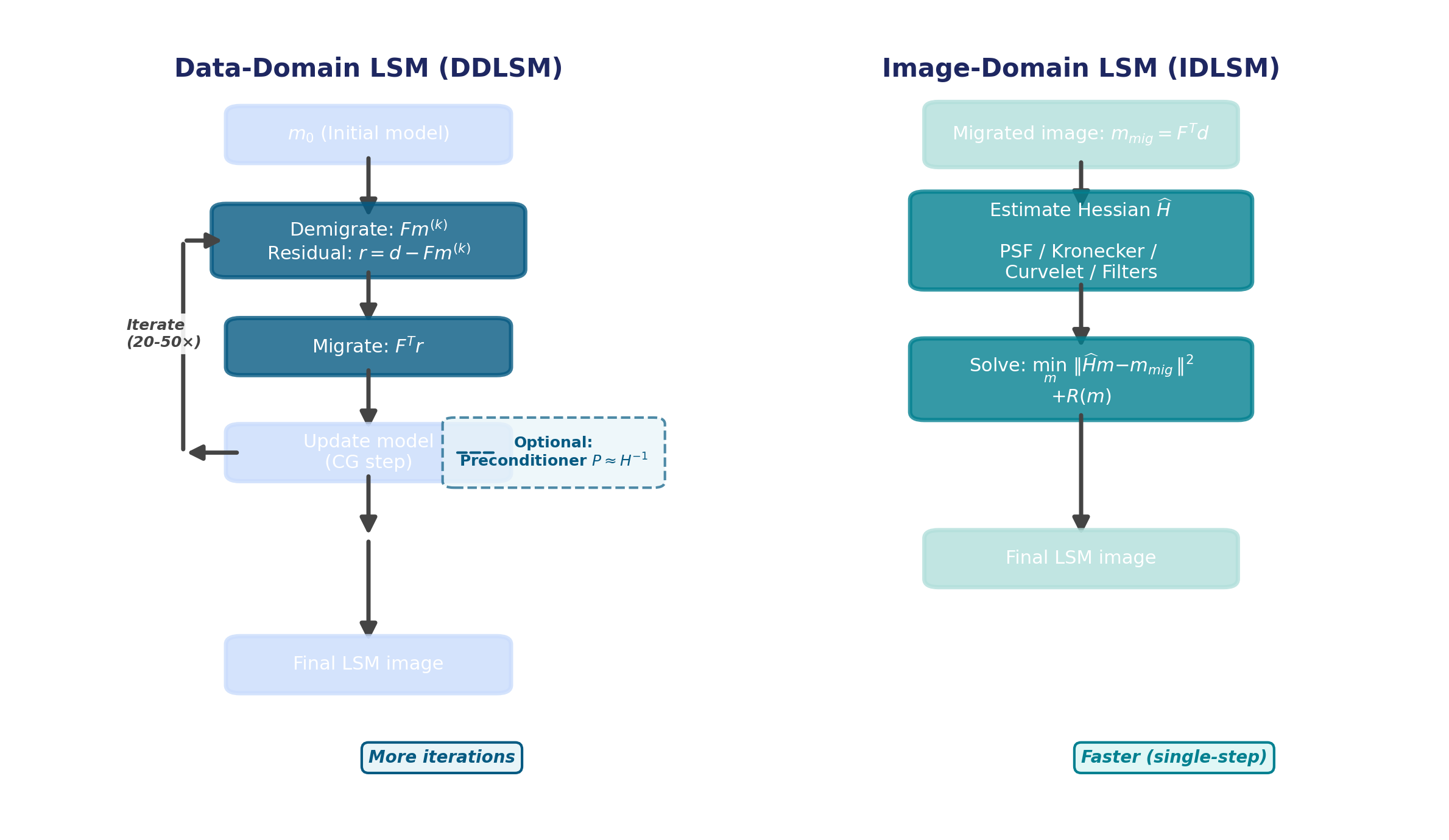 Side-by-side comparison of the DDLSM iterative workflow (left) and the IDLSM direct approach (right).