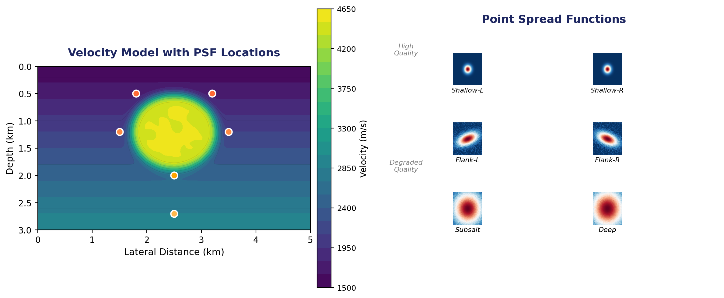 Left: velocity model with a salt body and marked PSF sampling locations. Right: corresponding PSFs showing how resolution degrades near salt flanks and at depth.