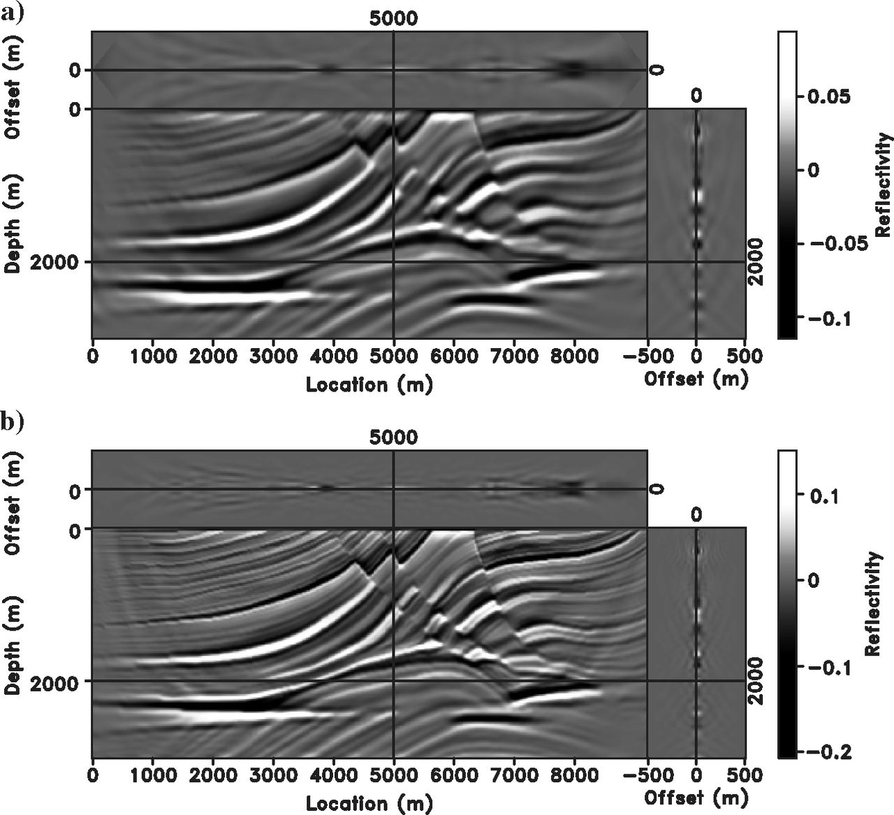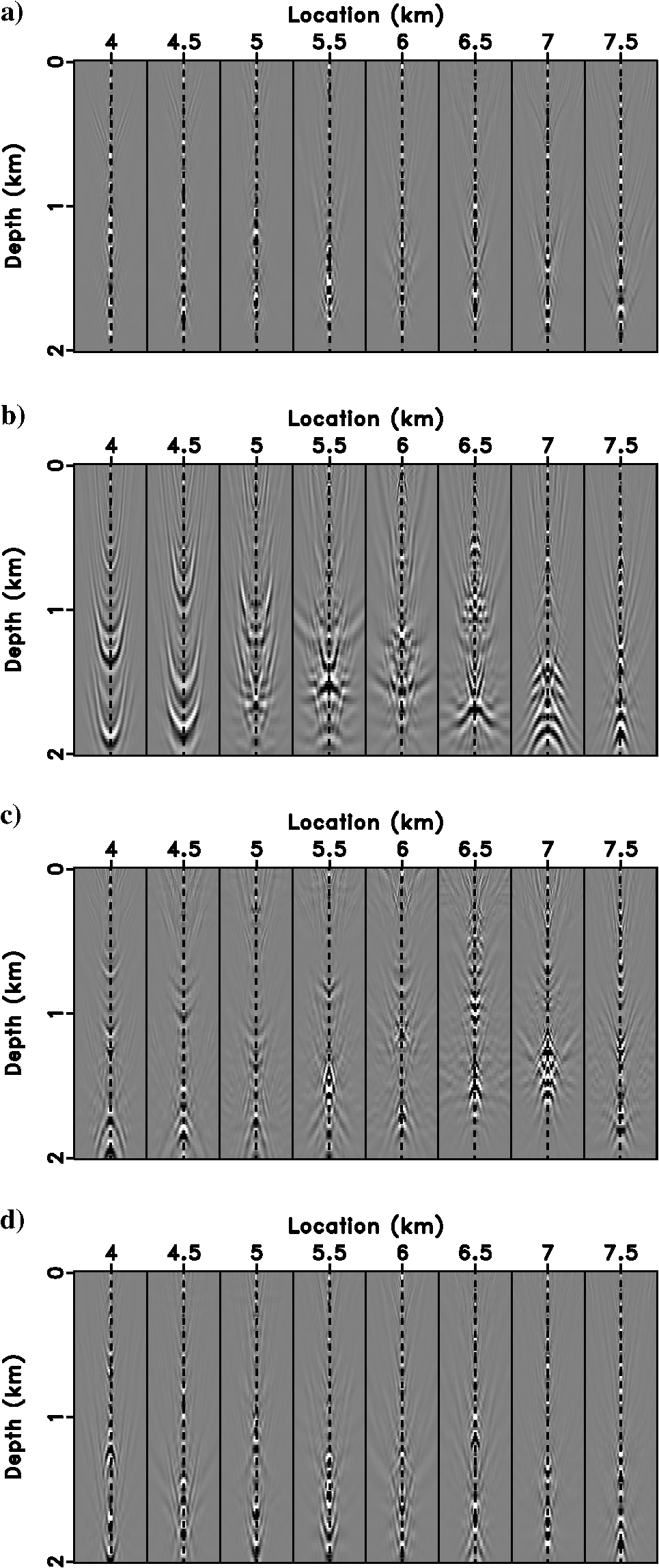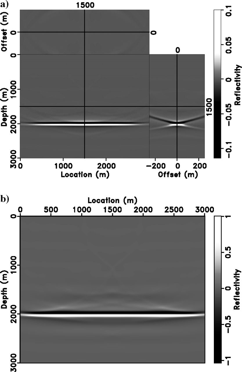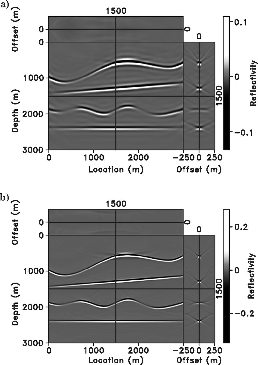where \(I(\mathbf{x}, h)\) is the extended image from either RTM (\(\bar{F}^*\)) or the approximate inverse (\(\bar{F}^\dagger\)).