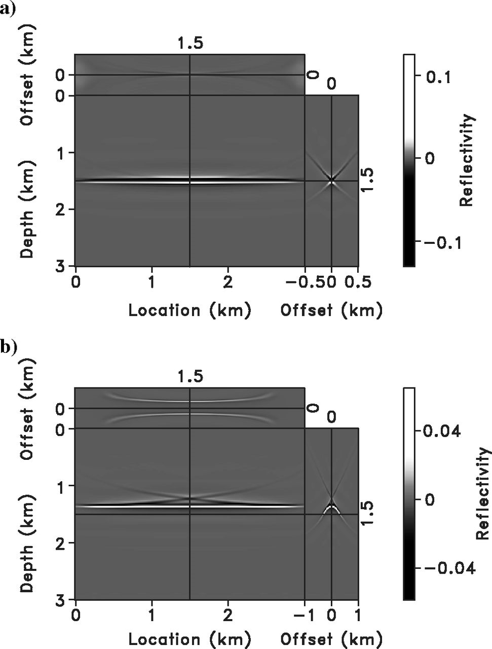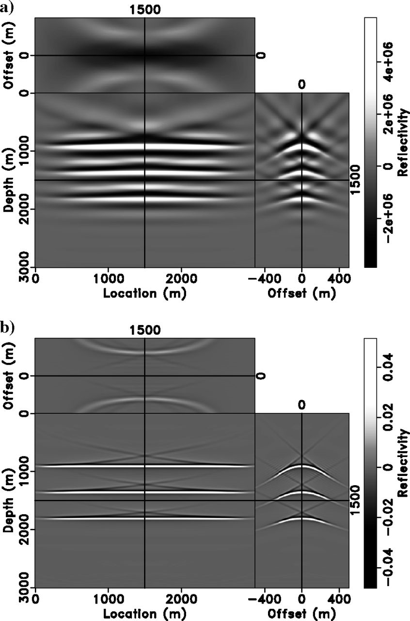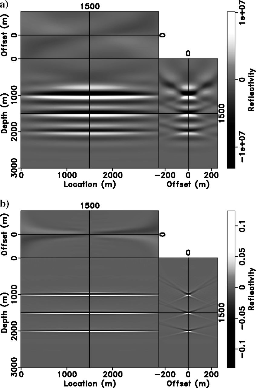 where \(I(\mathbf{x}, h)\) is the extended image from either RTM (\(\bar{F}^*\)) or the approximate inverse (\(\bar{F}^\dagger\)).