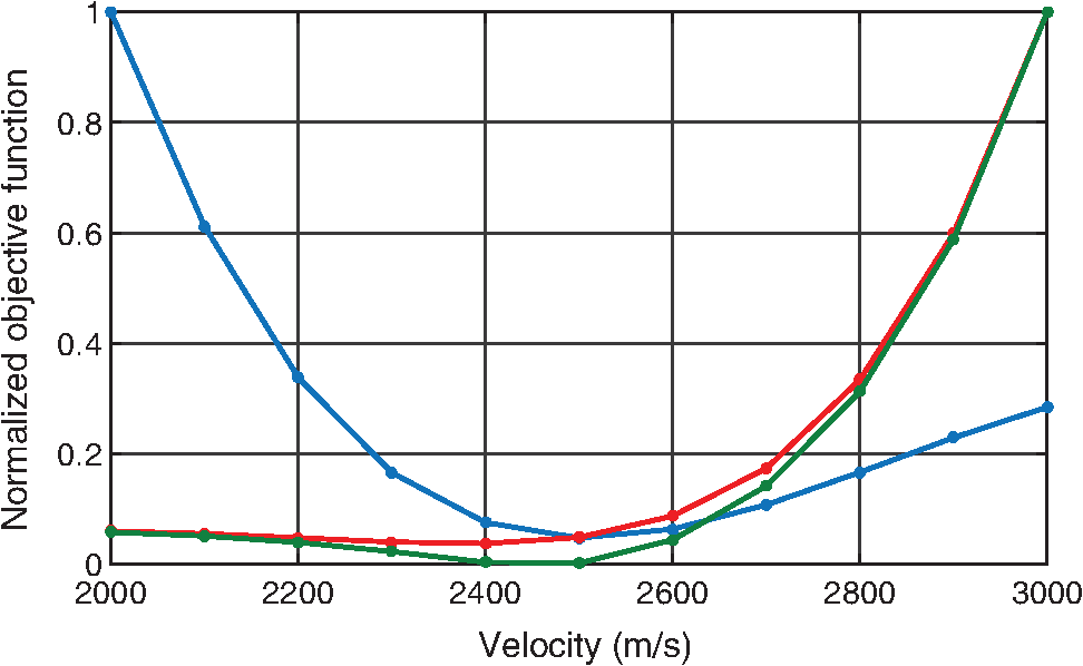 The MVA objective (red) has its minimum shifted to 2400 m/s — the wrong velocity! The IVA objective (blue) correctly minimizes at 2500 m/s. The so-called “gradient artifacts” are actually a problem of the objective function, not the gradient.