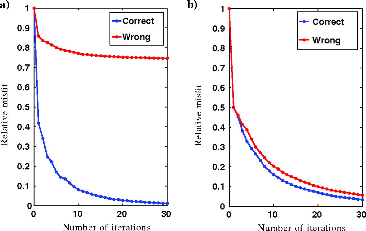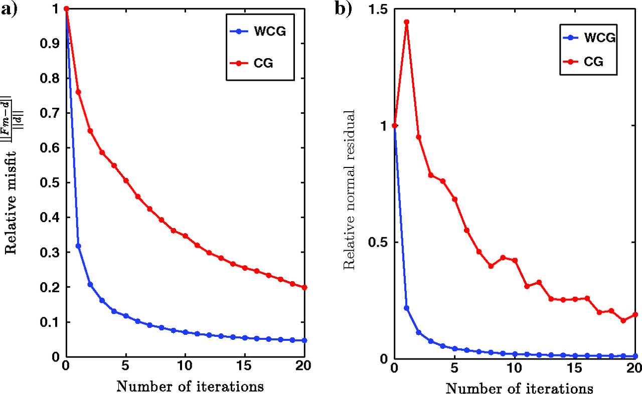 Because \(\bar{F}^\dagger \bar{F} \approx I\) (the extended Born operator is approximately unitary w.r.t. weighted norms), CG with weighted norms converges dramatically faster (Hou and Symes 2016).