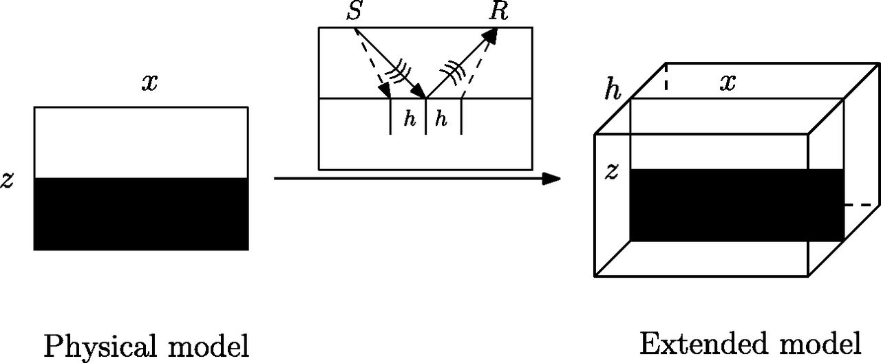 Sketch of the subsurface offset extension. The subsurface offset \(h\) is half the distance between subsurface scattering points. This extension allows stress to produce strain at a distance (Hou and Symes 2016).
